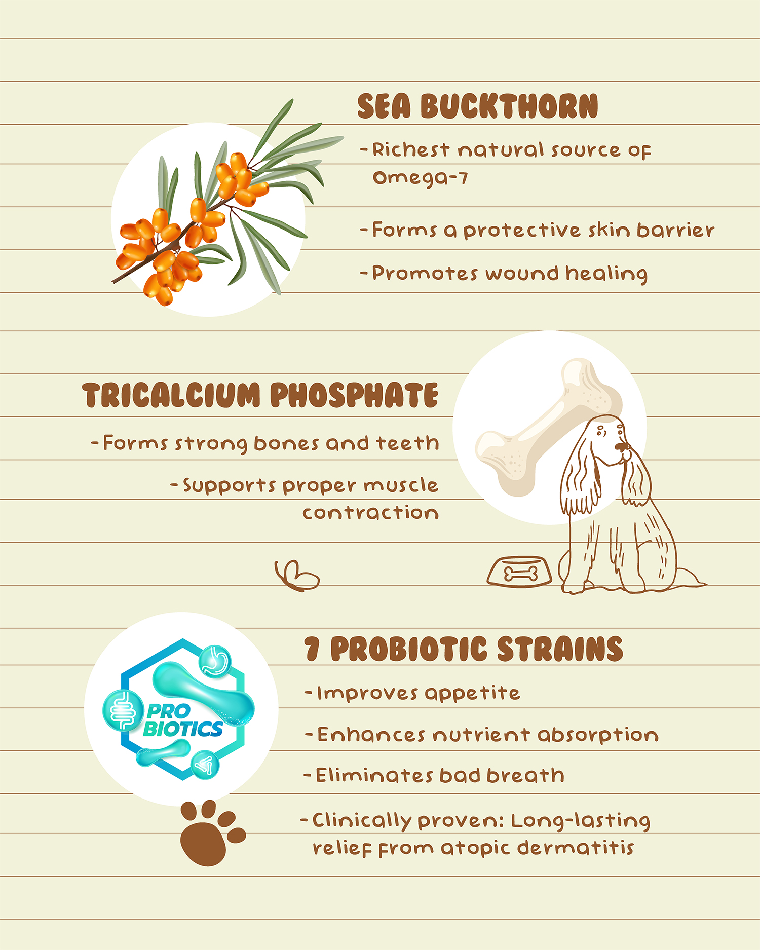 This blend of probiotics enhances appetite, improves nutrient absorption, helps reduce bad breath, and may relieve skin discomfort associated with atopic dermatitis.