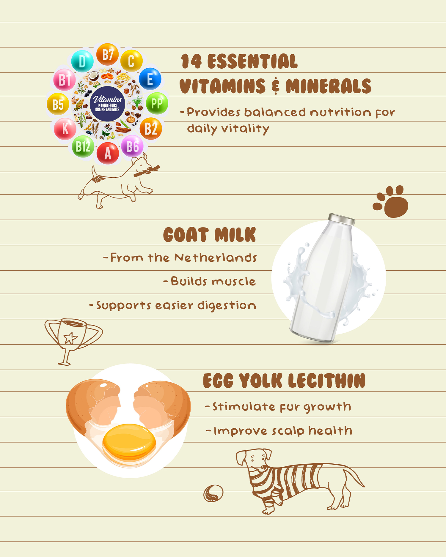 Goat milk provides muscle-building support and is easier to digest than cow’s milk, making it especially suitable for pets with sensitive stomachs.